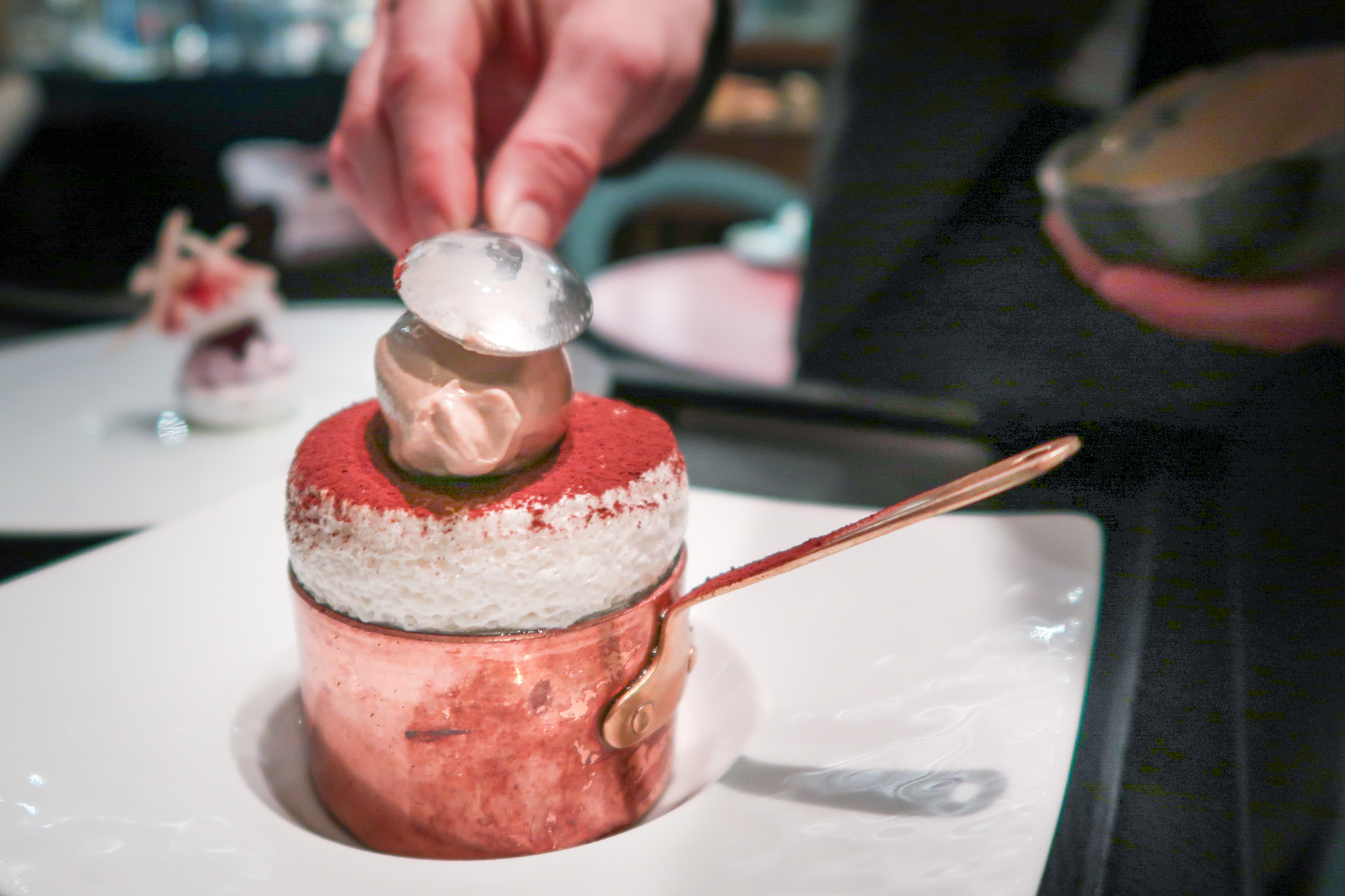 We krijgen een soufflé van tiramisu (waar paddenstoelen(!) in verwerkt zijn) met daarop koffie-ijs met mascarpone. Onze persoonlijke favoriet wat betreft de nagerechten.