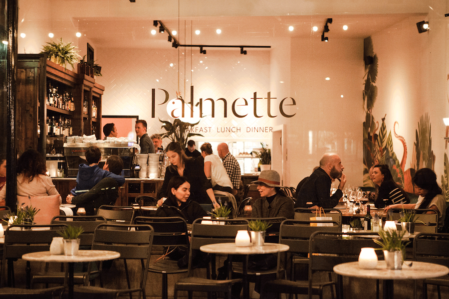 Als de avond valt, schuif je bij Palmette aan voor pulpo van de grill met chutney van tomaat, gefermenteerde knoflook, Taggiasche olijven en geroosterde puntpaprika. Of ga je toch voor de gebakken coquilles en bloedworst, bloemkoolcrème, witlof, hazelnoot en een citroen beurre blanc?