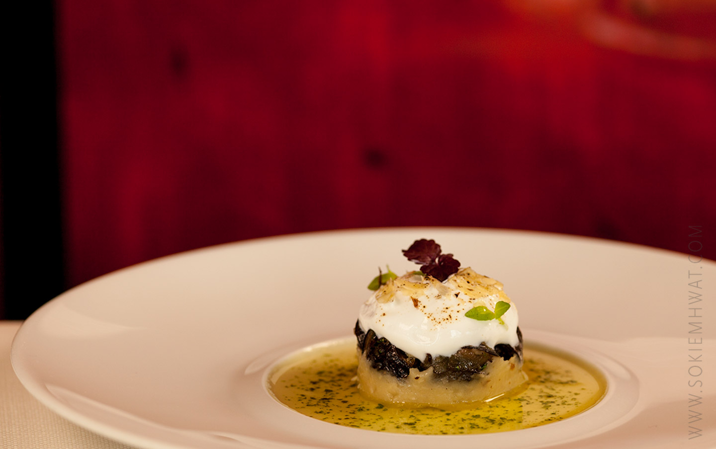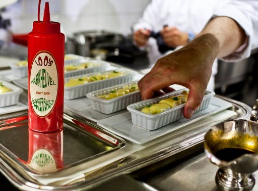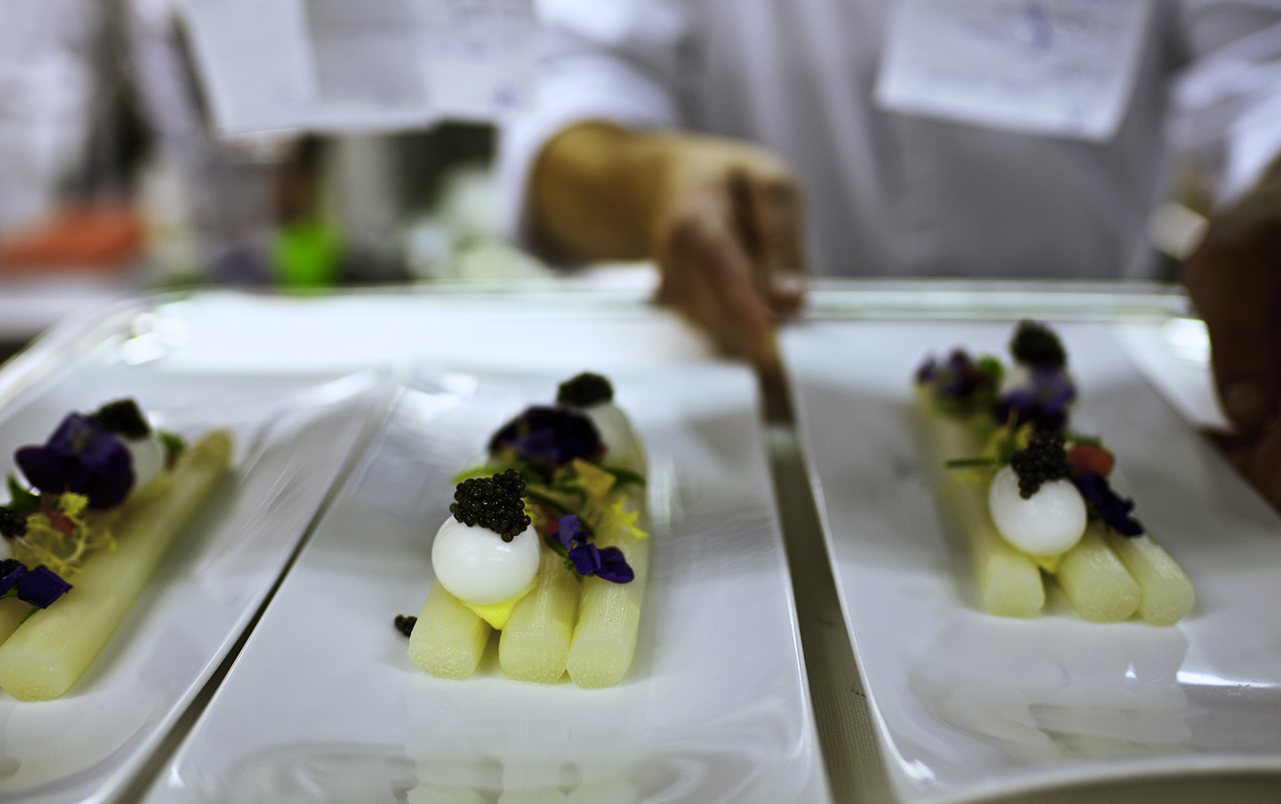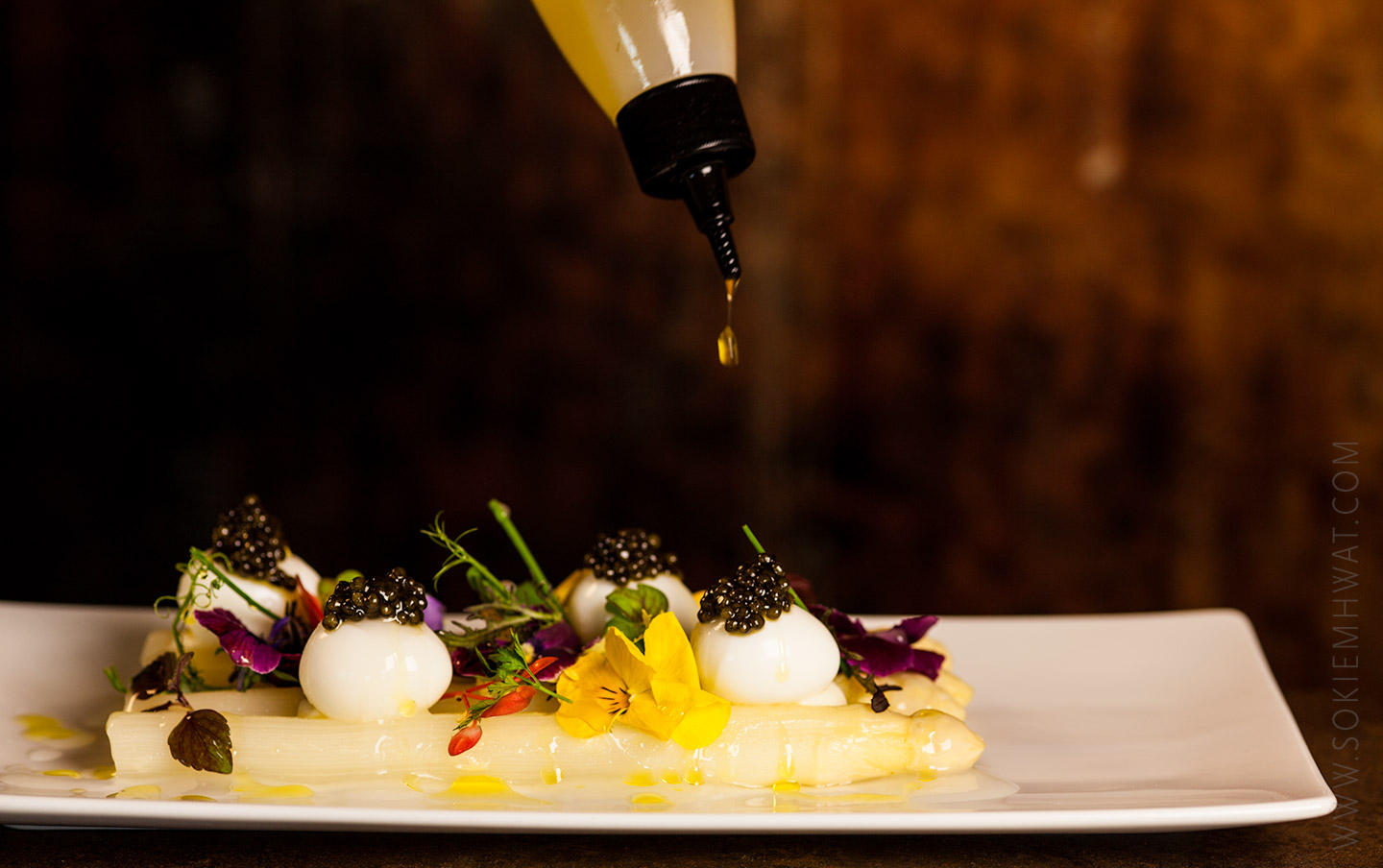 De gerechten ogen herkenbaar, maar Erik van Loo kan enorm verrassen. Een voorbeeld is de Asperge Special. Deze wordt geserveerd in de vorm van een frikandel speciaal. De ‘mayonaise’ is een hollandaisesaus, de ‘curry’ een ingedikte kreeftencoulis. En stukjes coquille dienen als ‘uitje’. Heel gaaf, vinden wij.