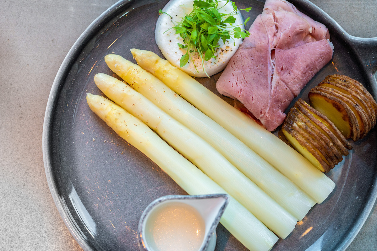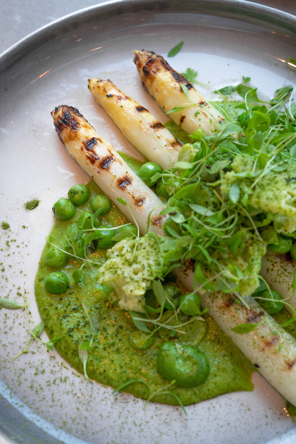Het aspergefeest gaat door met gegrilde witte asperges van de Josper houtskool-grill (ze zijn eerst sous vide gegaard, daarna gegrild), met een doperwtenpuree. Daarbij losse verse doperwten, tuinbonen, romanesco, poeder van peterselie en waterkers.