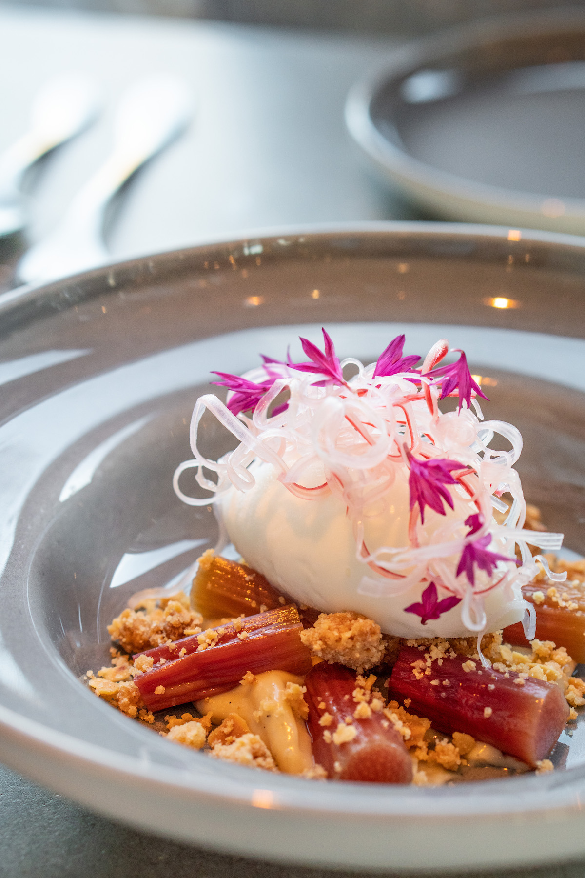En als we het toch over duurzaamheid hebben: de schillen van de rabarber zijn niet weggegooid, maar bovenop het ijs gelegd. De eetbare bloemetjes maken het helemaal af.