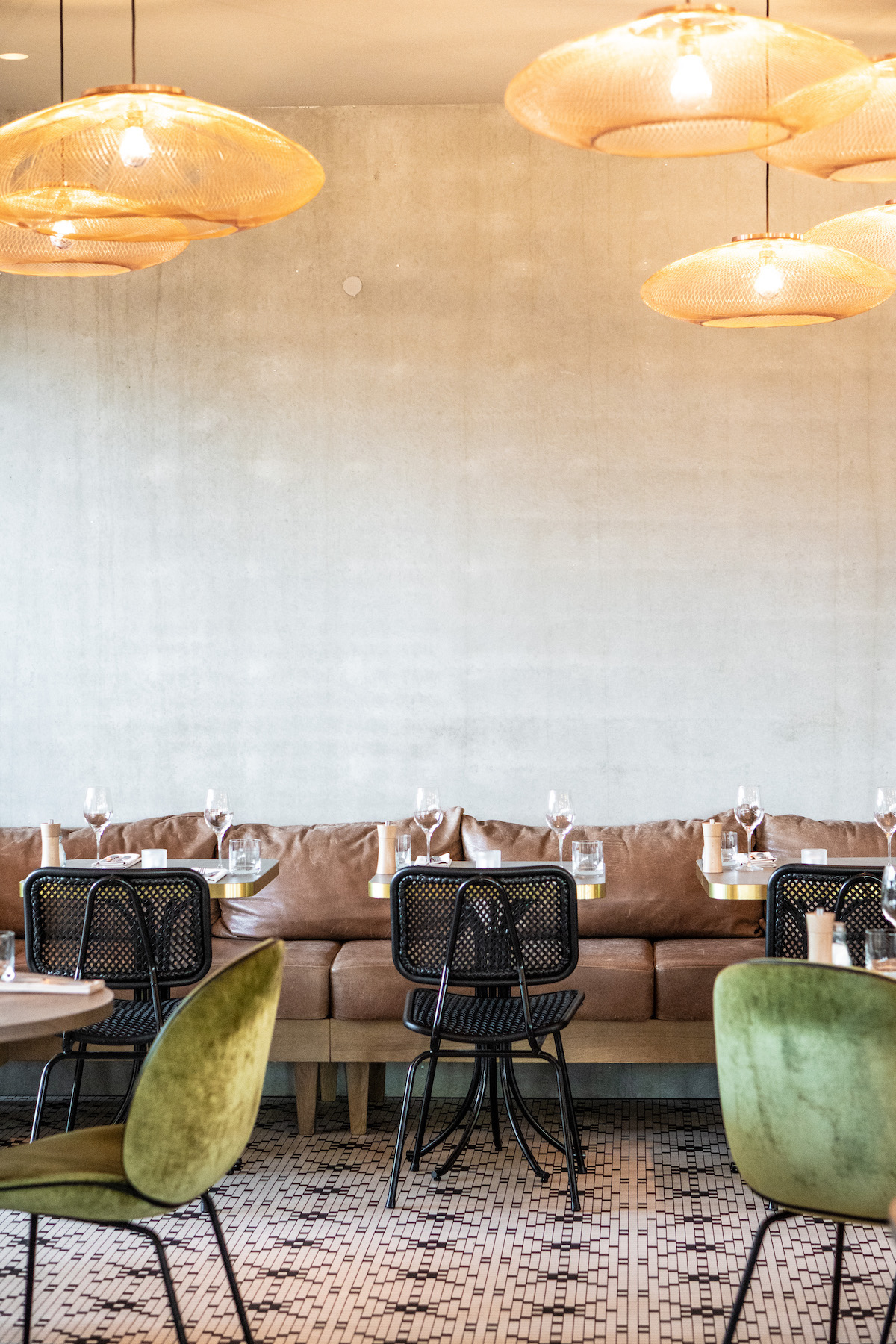 Het ziet er prachtig uit en ook het interieur van het restaurant is om door een ringetje te halen. Er zijn fijne banken waar je lekker op kunt neerploffen, stoeltjes in zachtgroen velours en houten tafeltjes met gouden metalen randen. Ja: hier zit je lekker.