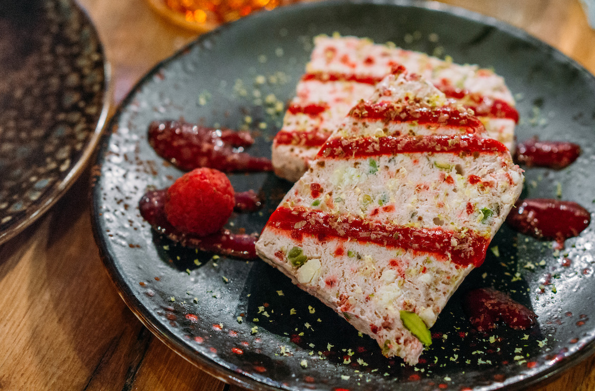 Ook de semifreddo is goed. Gemaakt met pistache, witte chocolade en frambozen is het een friszuur dessert, met veel texturen.