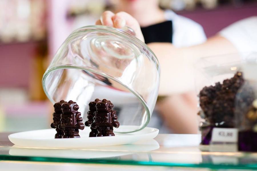 Maar ook prachtige zoete bonbons met karamel en pinda of mojito, macarons, muffins met pandan of framboos en prachtige hoge cakejes. En van de chocoladerobots worden wij instant vrolijk.