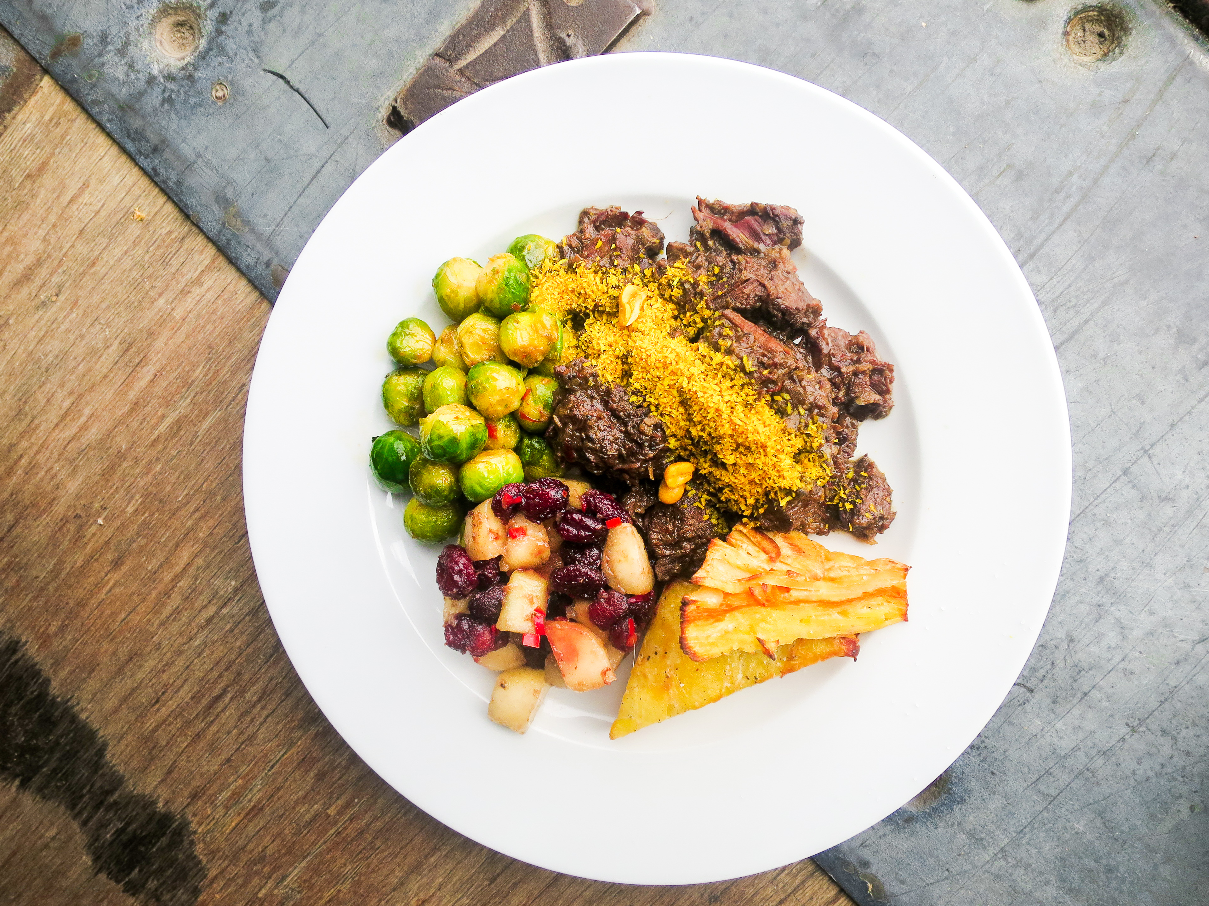 Hoewel rendang een Indonesisch gerecht is, doet de rendang à la Pllek eerder denken aan een wildschotel in een winters chalet. Zo krijg je naast de rendang ook perfect knapperige spruitjes, pastinaakgratin en een zoetzure perencompote. Tof hoe ze een Aziatisch gerecht van een Bourgondische twist hebben voorzien.