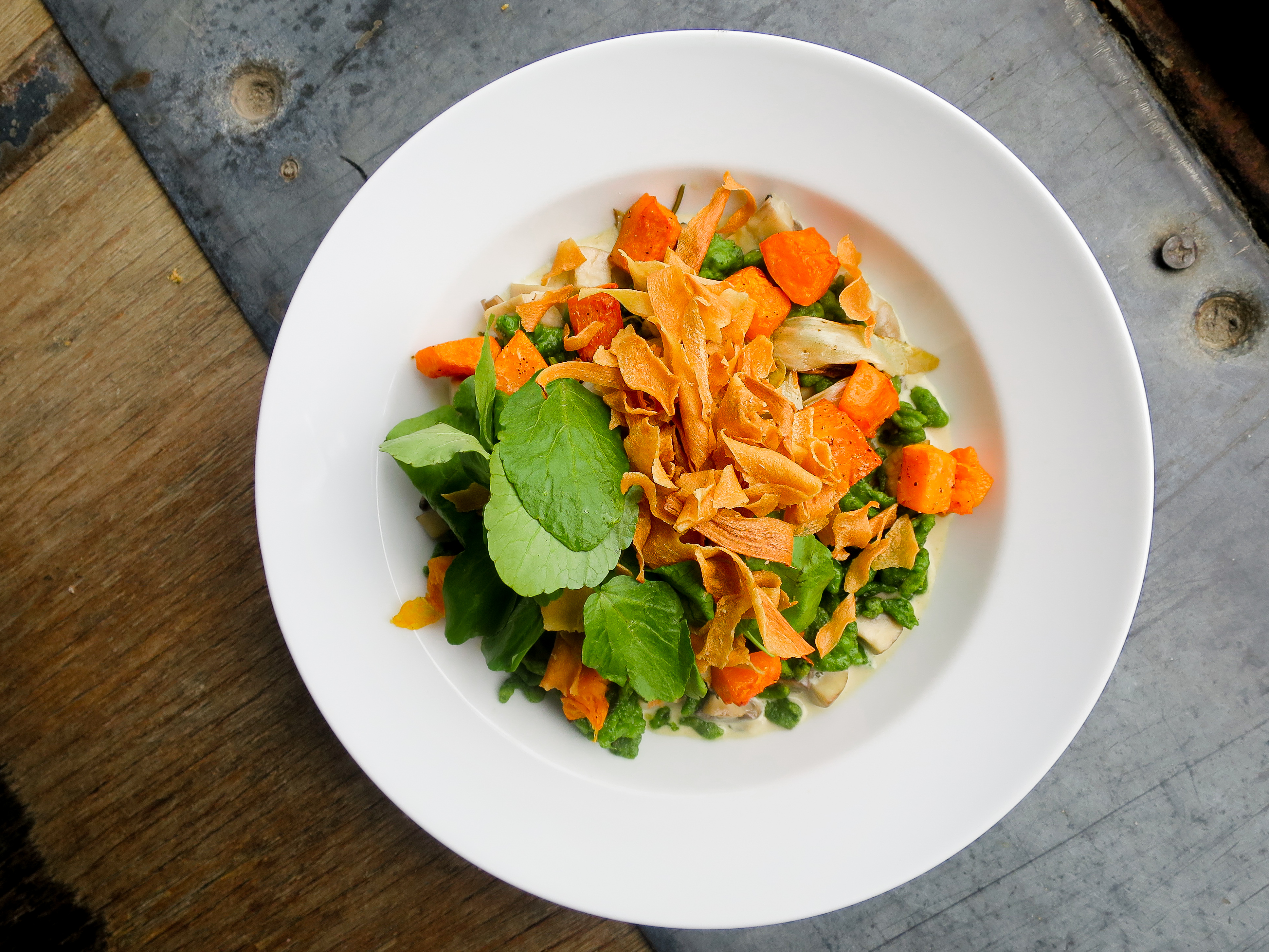 Toch is het het vega gerecht dat het meest onze verwachtingen overtreft. Sowieso vinden we het leuk om te zien dat de standaard vega optie voor een keer eens geen paddenstoelenrisotto of truffelpasta is maar spatzle: een Duitse variant van pasta, gemaakt van pannenkoekenbeslag.
