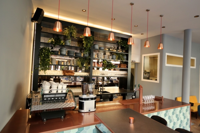 Daarnaast staat er midden in het pand, dat voorheen een warenhuis voor stoffen was, een grote leestafel en nog een hogere gezamenlijke tafel. De zaak speelt dus niet echt in op uitgebreid dineren, maar is meer een plek waar je overdag ontspannen kan zitten of met vrienden verzamelt voor een avond uit. Maar dan wél met lekker eten.