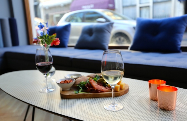 Langs de prachtig grote ramen loopt een bank waarop als wij binnen komen menig man achter hun laptop zit te werken. In de hoek van de zaak is het iets knusser, zeer uitnodigend voor een goed glas wijn en een borrelhap.