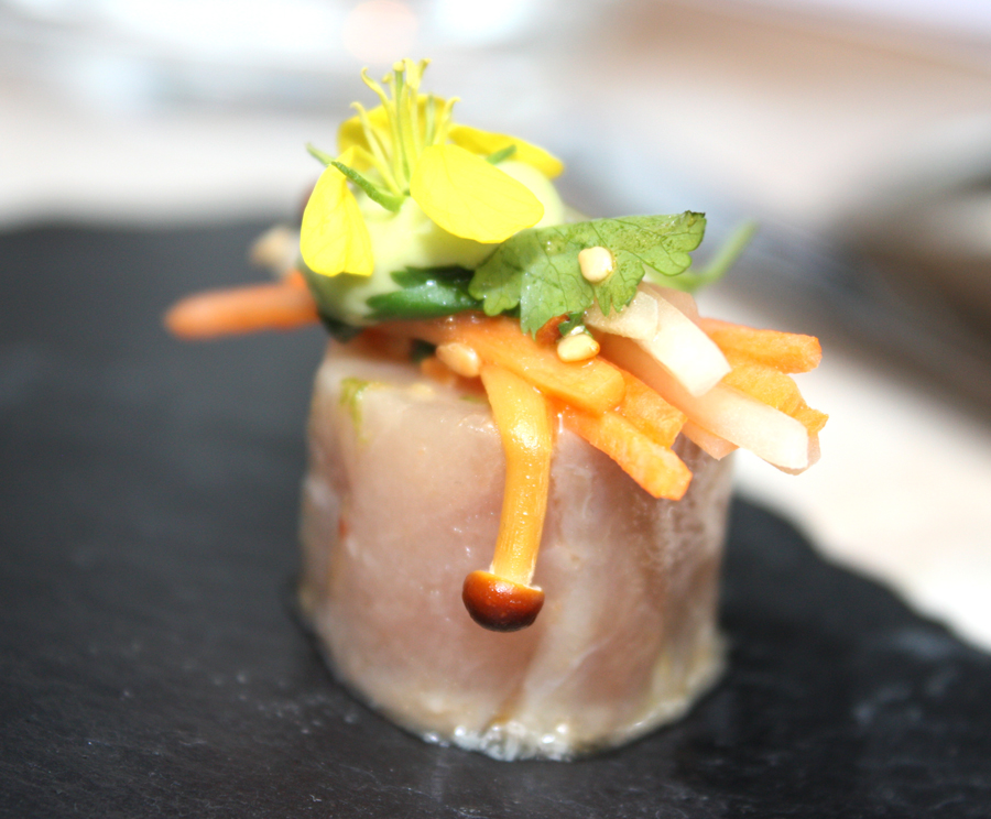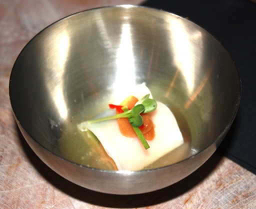 Na een kleine tour startten we met de eerste gang, geïnspireerd op de plek Ko Pi Pi Le in Thailand. Gemarineerde makreel met Tom ka kai en pijlstaartinkvis.