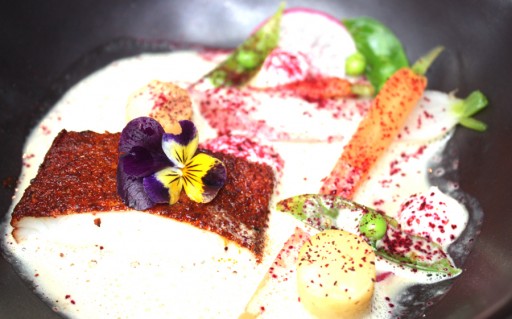 Na een kleine pauze (wat wel even nodig was na al dat lekkere eten) was het tijd voor het hoogtepunt van de lunch, een zeebaars in een zoutkorst. De zeebaars moest nog uit de zoutkorst worden gehaald en gefileerd worden, dit werd dan ook voor onze neus gedaan. De zeebaars werd geserveerd met gegrilde groenten en patatas bravas. Dit gerecht was geïnspireerd op de plek Tabernas in Spanje.