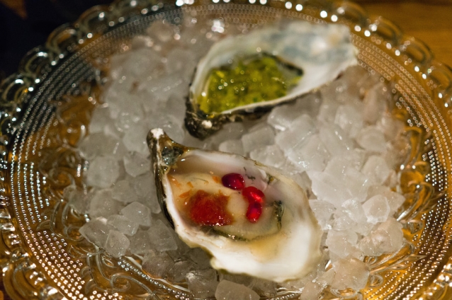 Daarbij bestellen we twee oesters die goed samengaan met de cocktails: met granaatappel en witte grapefruit voor bij de Corpse Reviver, de oester met komkommer en groene kruiden voor bij de Martinez. Het is de perfecte start van een relaxed avondje lekker eten.