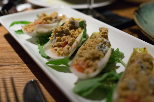 Op aanraden van de serveerster bestellen we ook de rauwe witlof met blauwe kaas en crumble. Het knapperige van de witlof is een goede aanvulling op de andere gerechtjes op tafel.