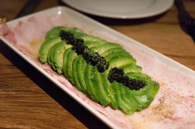 Ook op tafel komt het dungesneden buikspek met avocado en haringkuit. Een bijzondere combinatie, die toch goed samengaat: de uitgesproken romige, groene smaak van de avocado met het zoute buikspek en de ziltige kuit. Wel is het wat veel avocado naar onze smaak: een flinke hap.