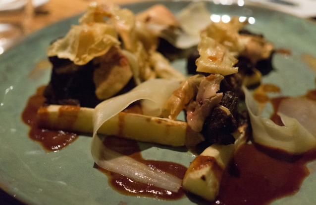 Voor de tweede ronde bestellen we de runderwang met specerijenjus, pastinaak en eendenlever. De jus is lekker kruidig, met veel kruidnagel. Leuk ook met die verschillende texturen van pastinaak en de romige eendenlever.