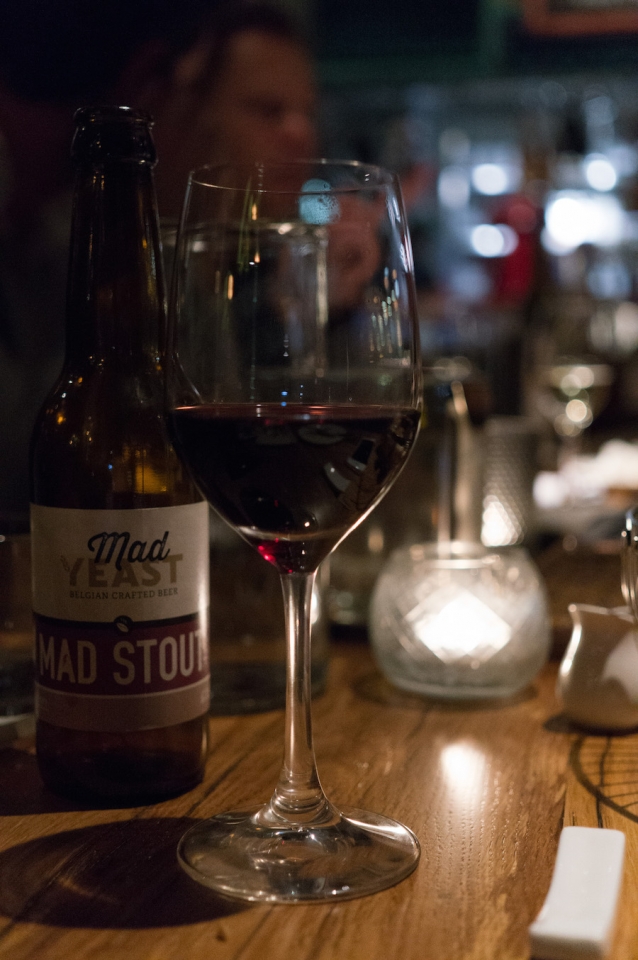 We drinken hierbij een rode wijn: de Primitivo di Manduria uit Puglia, Italië. Zacht en toch stevig, kruidig en verwarmend. Zalig. Voor de tafelgenoot een biertje: een stout, met tonen van koffie en chocolade.