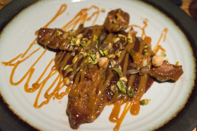 We zitten goed vol, maar willen toch nog dat dessert proeven dat ons de hele tijd aanstaart vanaf de menukaart: vijgen carpaccio. Met zoute karamel, pistachenoten en hazelnoten. Lekker en niet te zwaar. Bestel hier – als je nog ruimte hebt – de witte chocolademousse bij.