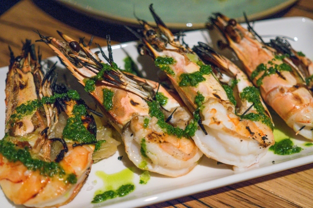 De garnalen met groene kruidenolie zijn stevig en ziltig en de venkelchutney die eronder ligt, kan goed opboksen tegen die stevige smaken.