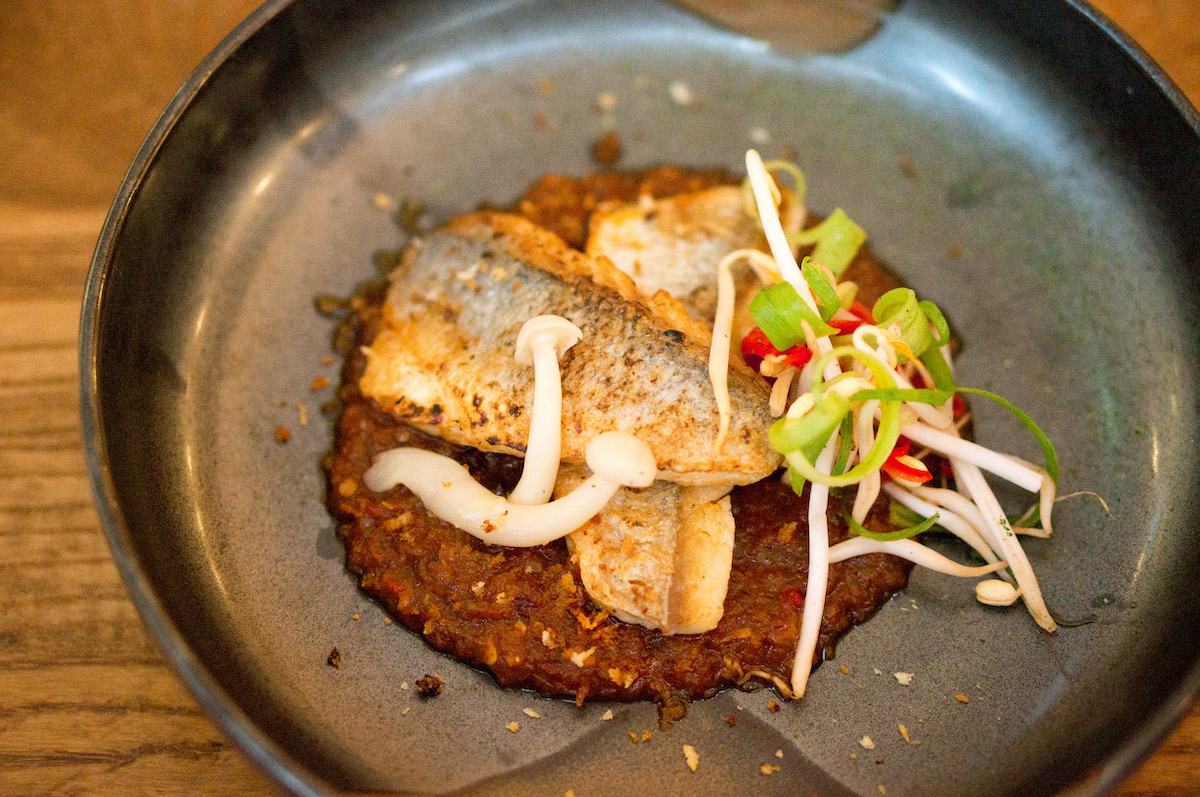 Ook de zeebaars is goed: mooi krokant gebakken en opgediend in een saus met tamarinde en kokos. Niet alleen met hele lekkere smaken, maar ook met een verslavende textuur.