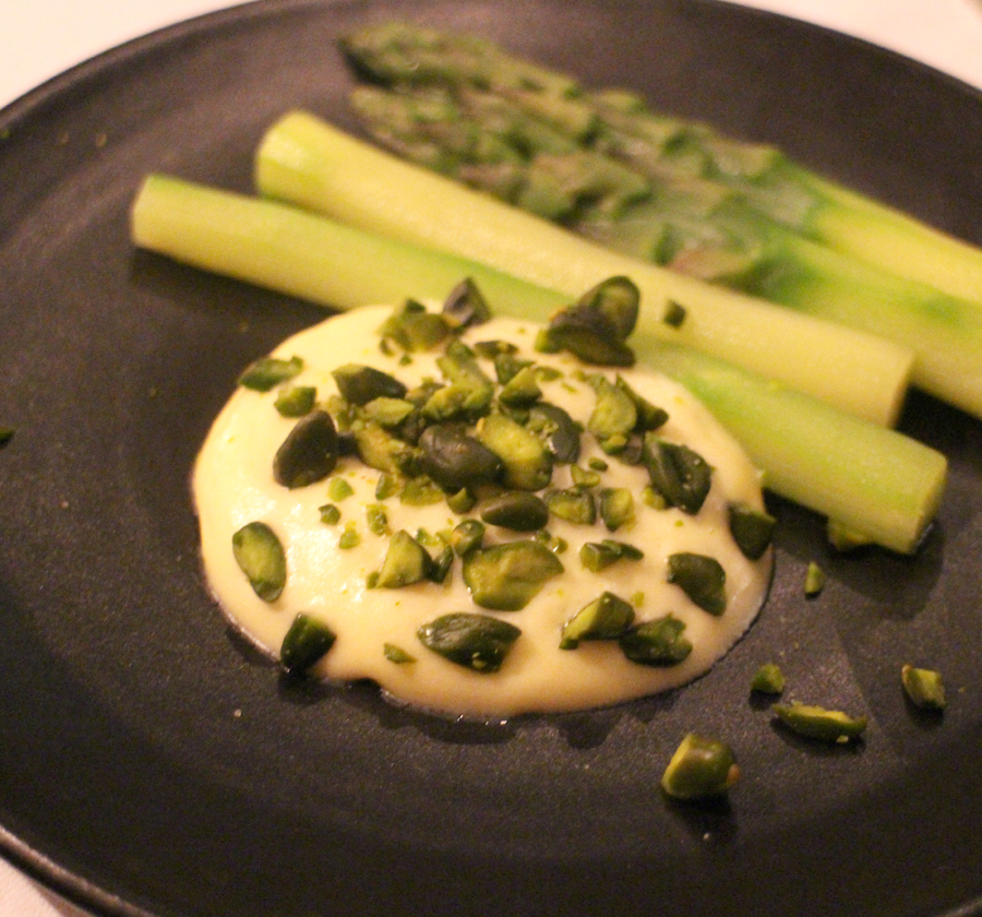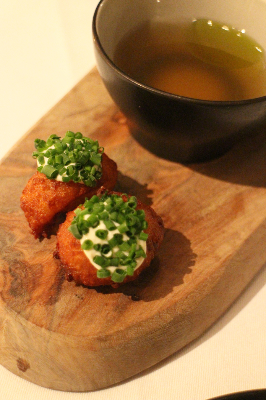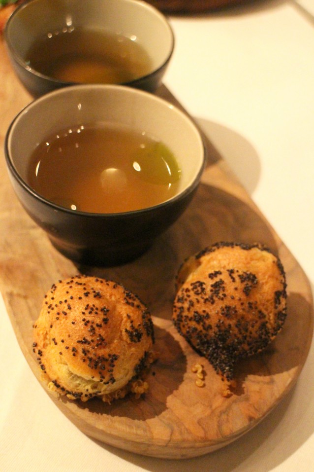 Om te beginnen krijgen we een stukje brood met boter geserveerd, inclusief een parade aan smaakvolle amuses: groene asperges met Hollandaise en pistache, een soesje met paddenstoelenragout, een bouillon van kruidensteeltjes en een pommes dauphine met ham.