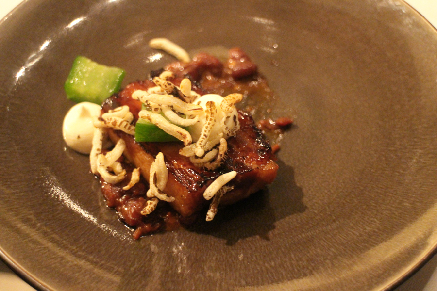 Om de hartigheid af te sluiten gaan we terug naar waar het allemaal begon: het buikspek met zwarte bonen, Schezuan-peper, gepofte wilde rijst, komkommer en zure room uit de tijd van Daalder.