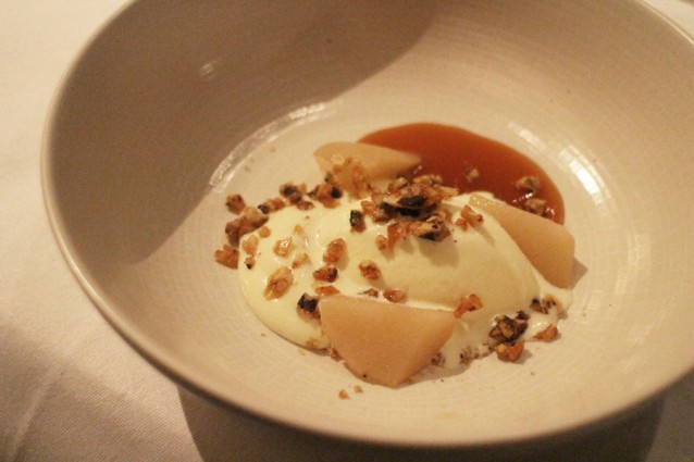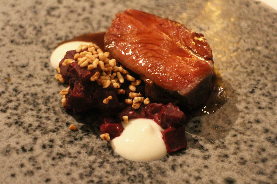 De overgang naar zoet wordt aangekondigd met een prachtige dessertamuse van rodebietensorbet met een chocoladecrème. Hierna is het helaas tijd voor het einde, in de vorm van rozemarijn-ijs met peer, gezouten karamel en krokante macadamianootjes. Het toetje is niet zo spectaculair als de eerdere gerechten, maar doet zeker niet onder op het gebied van smaak.
