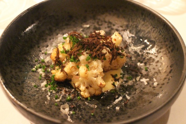Het gerecht ‘waar iedereen het over heeft’, bloemkool gefrituurd in beurre noisette met zwarte wintertuffel en ‘Nederlandse Manchego’, is wederom heerlijk. Het wordt bijna eentonig, maar mán wat kunnen Guillaume en Freek toch koken!