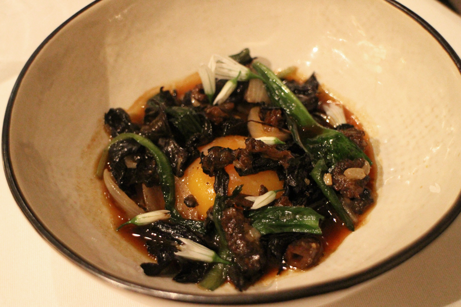 Voor de tafelgenoot die niet van lamsvlees houdt is er een misschien nog wel beter gerecht: de perfecte eidooier (urenlang gegaard op 63 graden) met trompette de la mort en morilles, kippenjus, knoflookbloemen en daslook. Dit gerecht is om van te huilen, zo lekker!