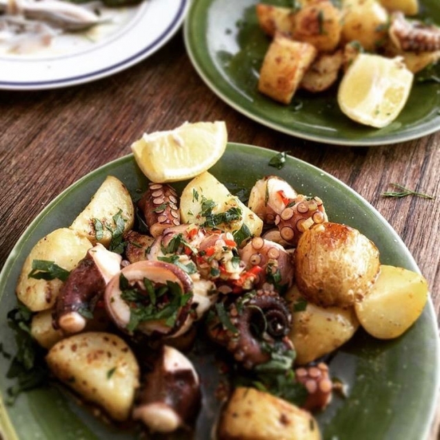 Maar goed, we hadden het over het eten. Denk aan gegrilde scheermessen, pimientos de padrón, plakjes rundvlees van Rubia Gallega (een runderras uit Galicië) met venkel en bramencompote, oesters, pulpo en gegrilde sardines met gremolata.