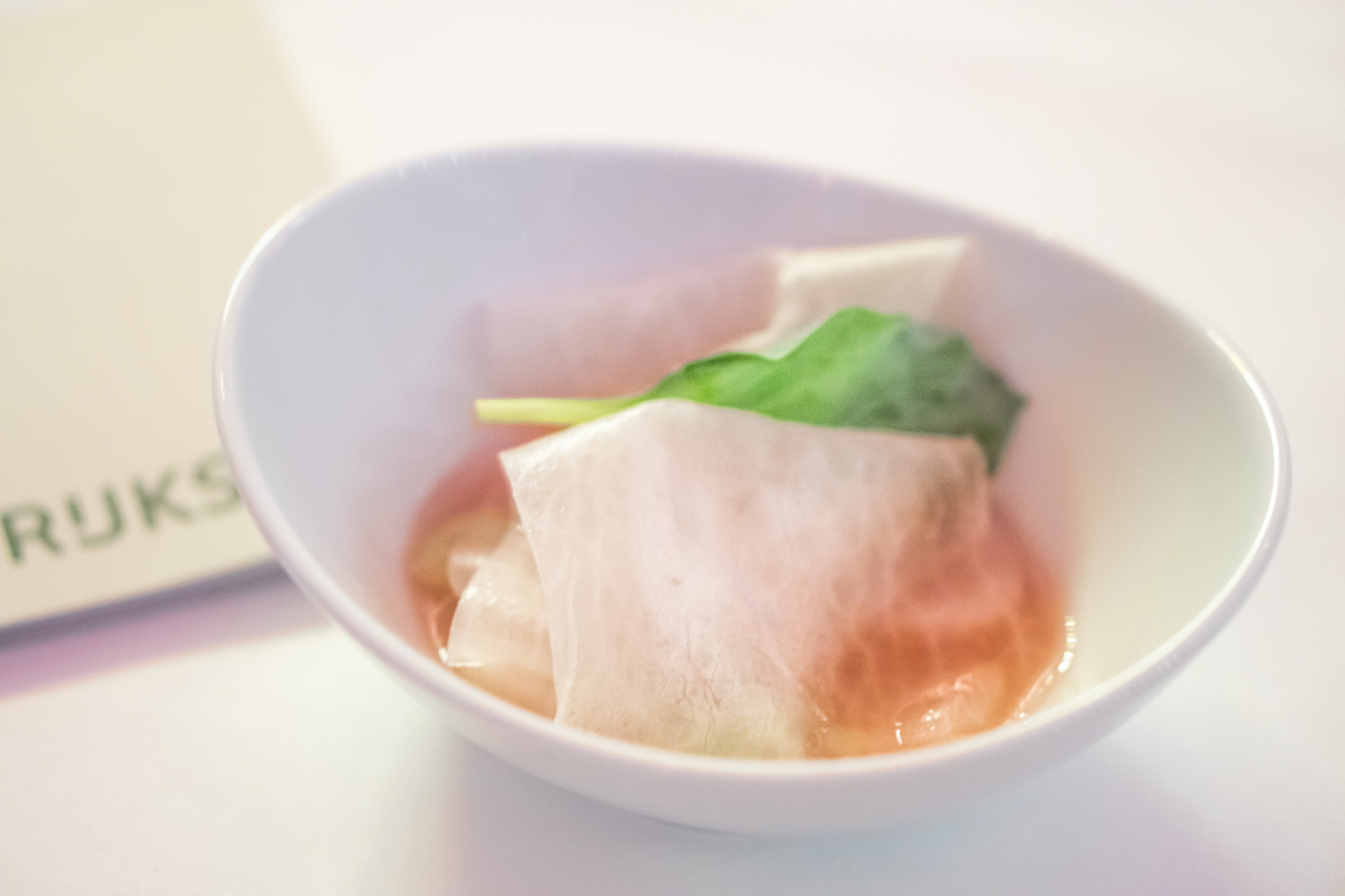 St Jacobsmossel met rettich en codiumvinaigrette. Alsof coquille en rettich een liefdesbaby hebben gemaakt en die onderdompelen in een badje van umami. Die vinaigrette wil je tot de laatste druppel opslurpen.
