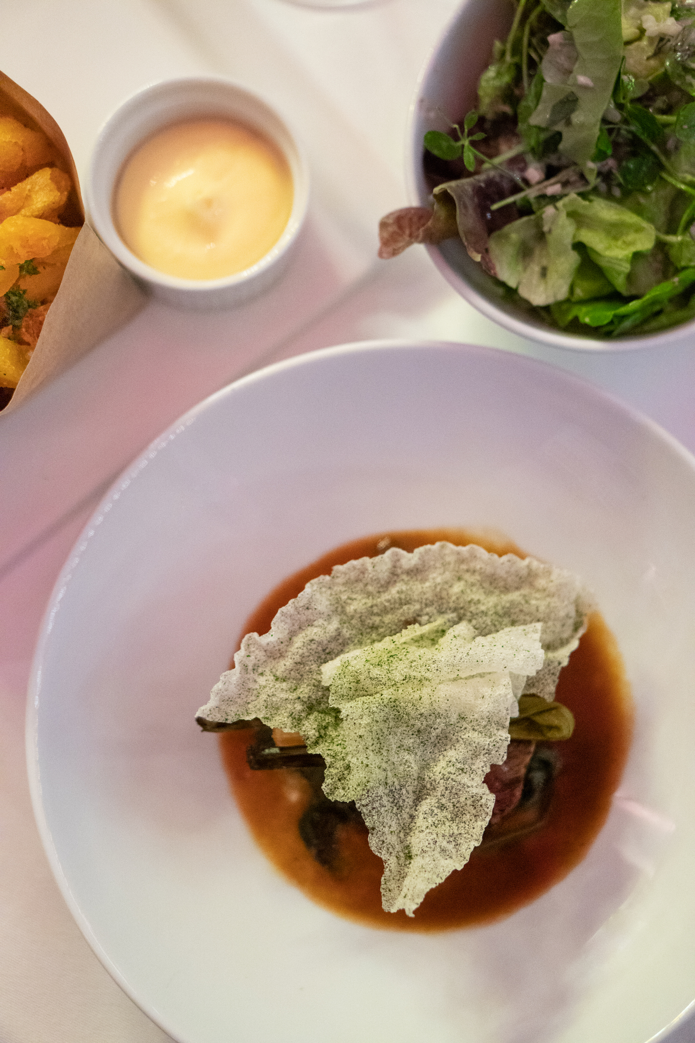 Het hoofdgerecht: runderwang met bosui en spinazie. Daarbij friet gebakken in ansjovisboter (!) en een frisse salade met dragon. Zó goed. Alleen al voor de friet zou je hier meteen terug willen komen.