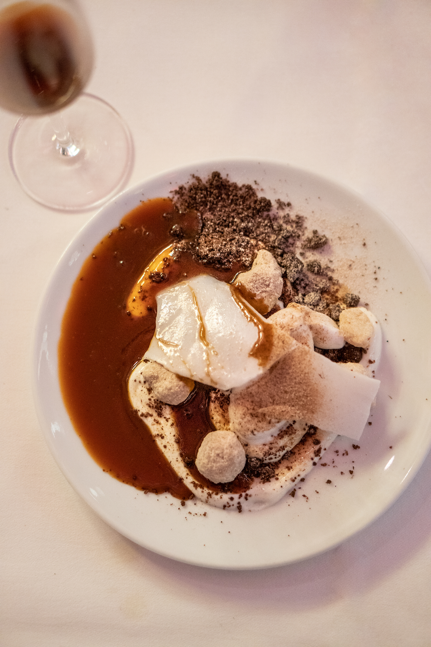 Maar niet voor het dessert de kerk uit. Margot Janse was de eerste gastchef van een serie grote namen die kookten bij RIJKS. Haar dessert van baobab met honeybush karamel en hangop staat nu weer op de kaart. Heerlijk met de bijpassende dessertwijn: een supergeconcentreerde, stroperige sherry met een smaak van krenten en chocolade (Cardenal Cisneros). Alsof er een engeltje over je tong… je snapt ‘m.