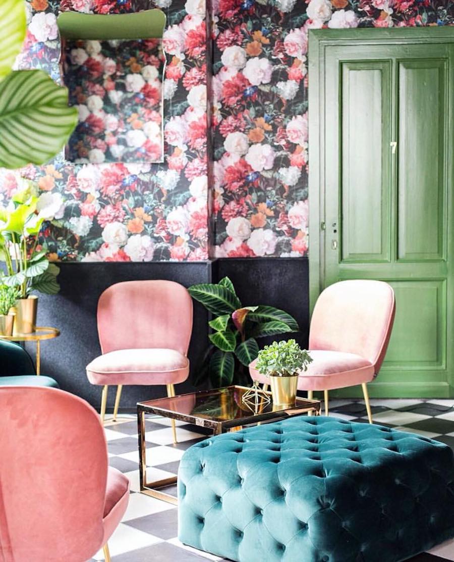 Verwacht hier veel roze, fluweel en bloemetjesbehang (met rozen, uiteraard). De bar is roze, de achterwand groen en door het hoge gehalte aan planten waan je je een beetje in tropische sferen.