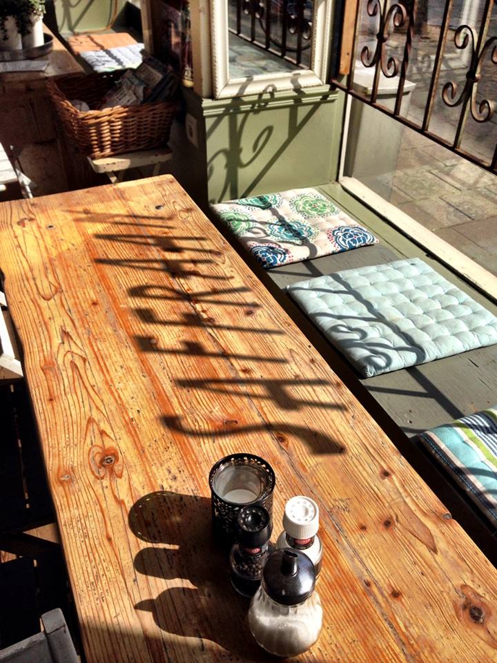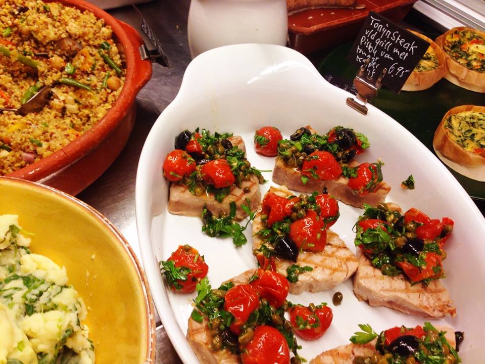 Saffraan presenteert buiten op krijtborden haar menu en dagelijks wisselende daghap. De mediterraanse uitstraling en de met lekkers gevulde toonbank maken het je wel heel moeilijk om door te lopen naar de supermarkt, die er praktisch naast zit…