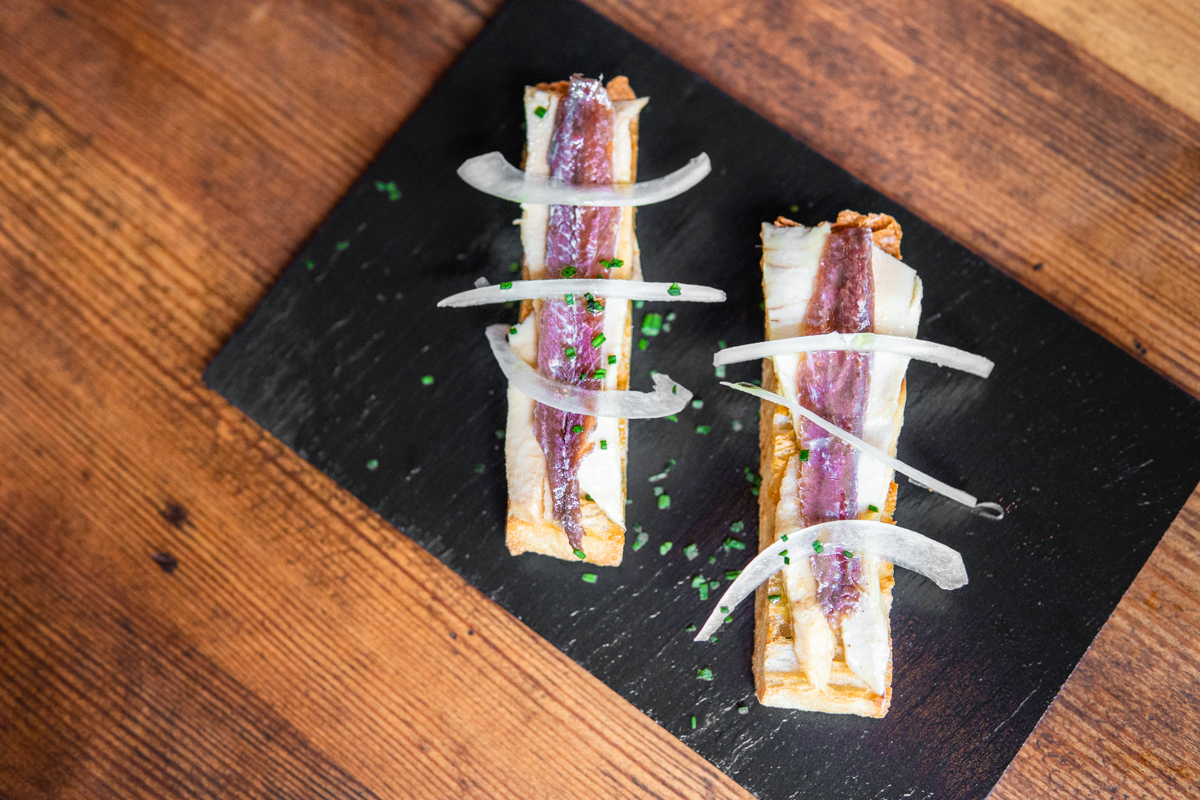 Er is ook een traditioneel hapje van Bonito: buik van witte tonijn met ansjovisfilet uit Getaria. Verrukkelijk.