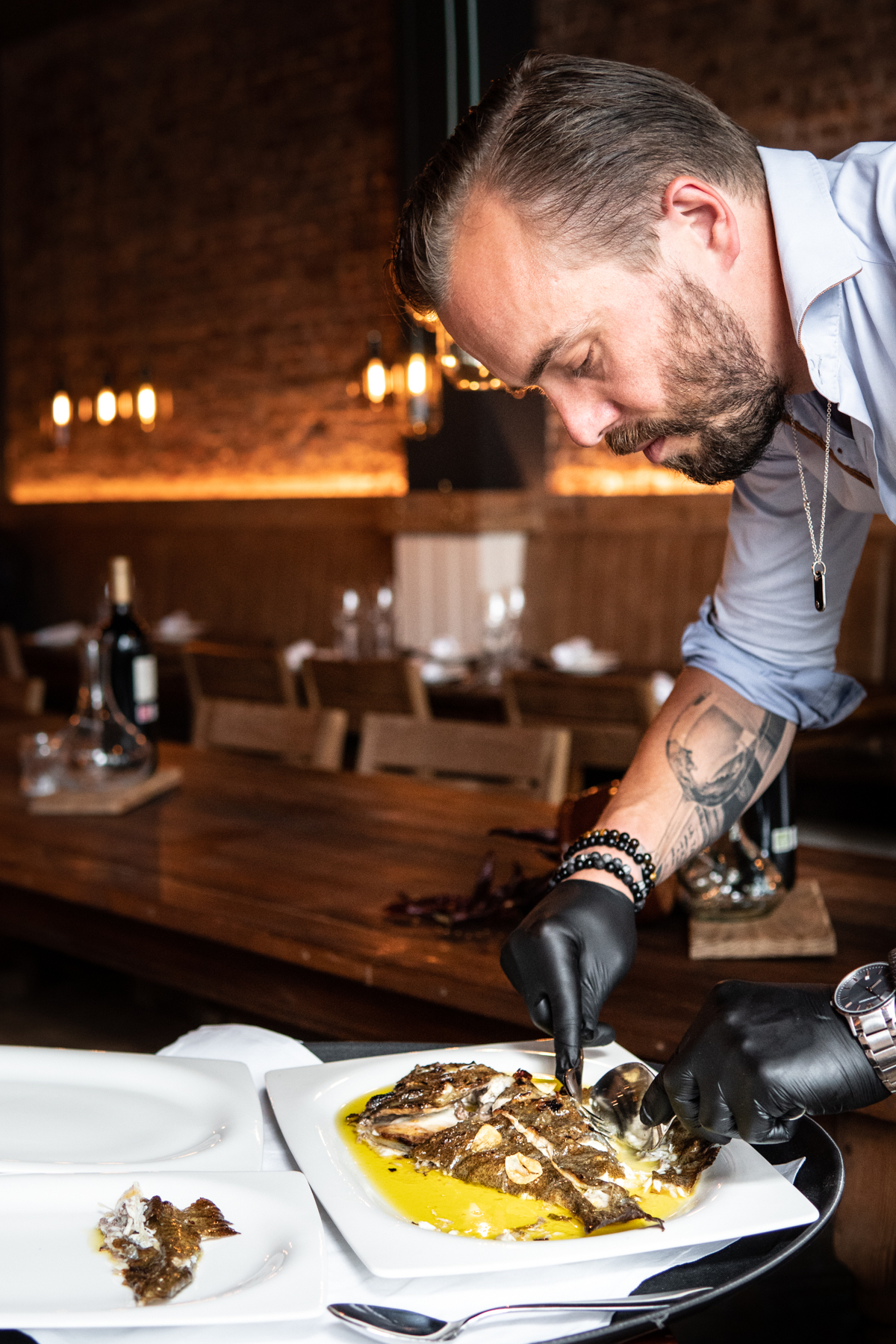 Hij verdeelt de tarbot in drie stukken: de zachte buik, de rug – die iets steviger is – en wat ze de ’tranen van de vis’ noemen. Daar kun je lekker aan kluiven en dit stuk bevat de meeste smaak.