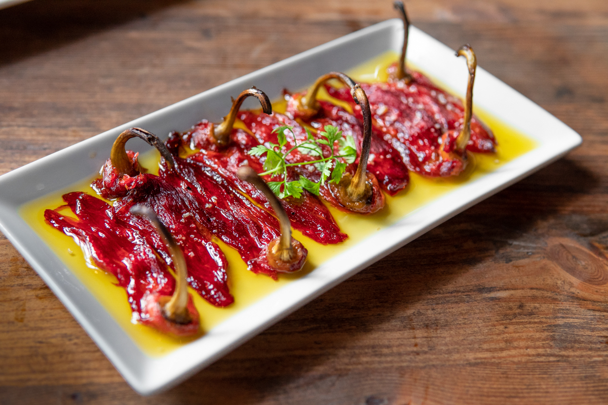 De Piquillo peppers die we erbij geserveerd krijgen, zijn 13 uur gegaard en helemaal gekarameliseerd. Heerlijk sticky.