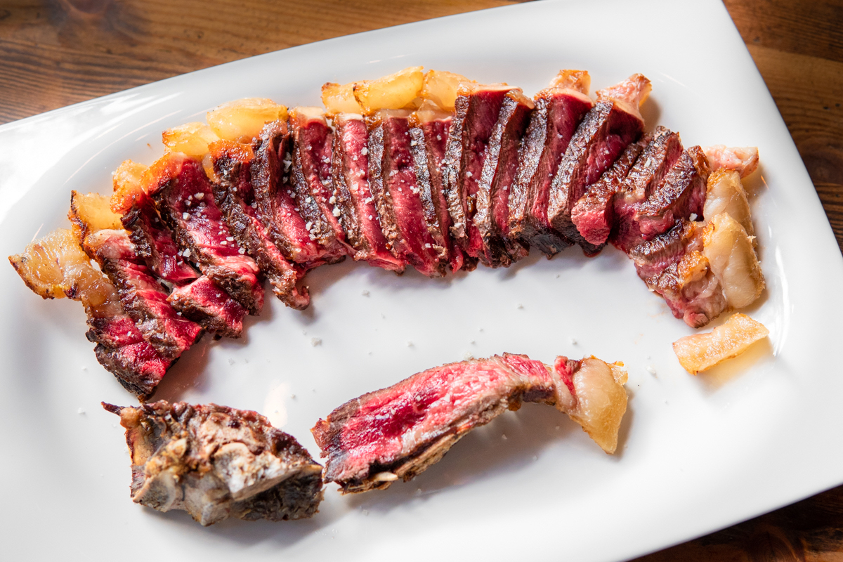 Maar we zijn er nog niet. Er is namelijk ook nog een prachtig stuk txuleton voor ons gegrild. Dit premium gerijpte rundvlees wordt puur opgediend: in plakjes gesneden met een beetje grof zout erop. De smaak is oorverdovend. Door de rijping heeft het een fantastische notige smaak gekregen; het vetrandje is gepoft op het hoge vuur – bijna als chicharrón, maar dan van rund.