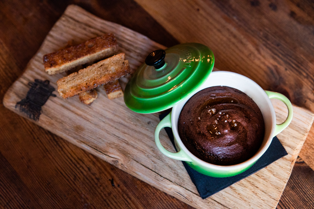 We ploffen, maar wagen ons toch nog aan het toetje en dat is gelukkig helemaal in ons straatje. In een pannetje van Le Creuset verschijnt een mix tussen een chocolademousse en een flan, geserveerd met gefrituurde breadsticks met zout en kaneel.
