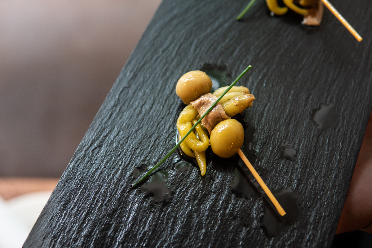 Vincent schotelt ons de “eerste pintxos ooit gemaakt” voor, zoals die in de jaren ’40 ontstond in een bar in San Sebastian. Het stokje heet La Gilda en bestaat uit olijven, ansjovis en pepertjes: een combinatie die meteen wakker schudt.