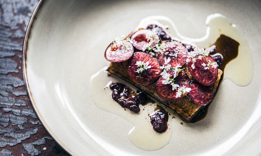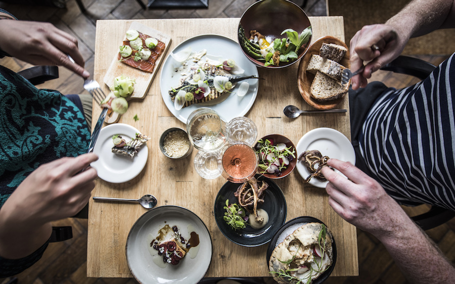 De gerechten veranderen mee met de seizoenen, maar om je een indruk te geven, kun je denken aan koolrabi met basilicum en gin. Of doperwten, morieljes en Cheddar. Asperges en huisgemaakte breasola. Lamsnek en lentegroenten. Of aardbeien sablé. Of sticky toffee pudding.