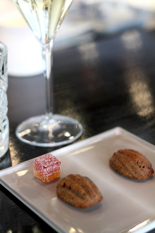 Een hartige madeleine (met zwarte olijf) en een semi-hartig stukje Turks fruit met rode paprika en gezouten limoen
