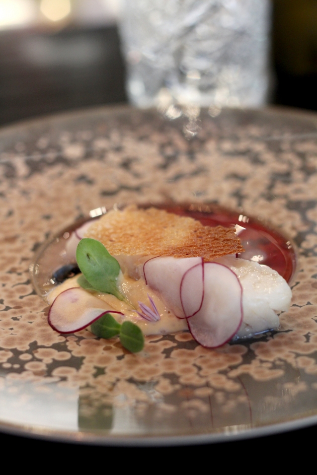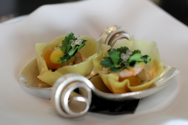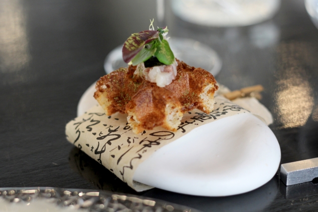 De eerste amuse: een gesouffleerde wafel met hamachi tartaar, kombu en yuzu, geïnspireerd op Kyoto