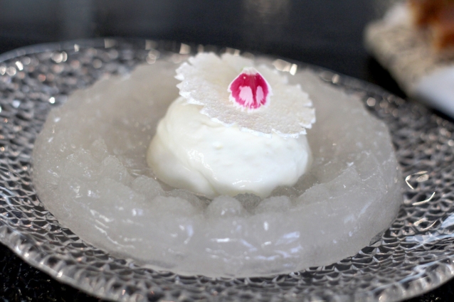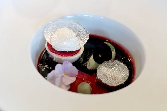 Het dessert: structuren van griotte (een zure kers), kokos, basilicum en hibiscus.