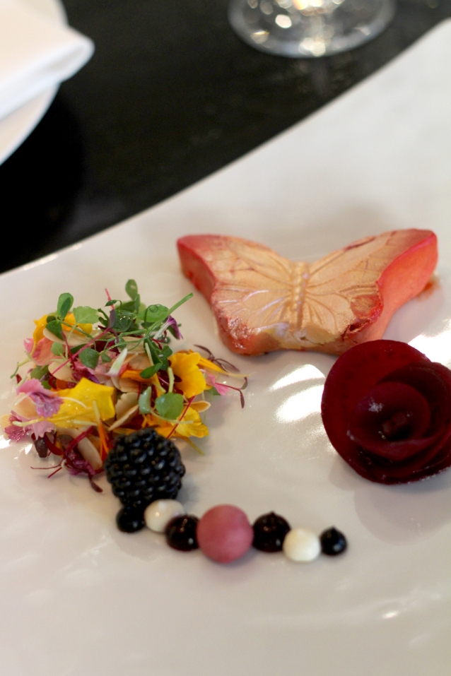 Een vlinder van ganzenlever, geïnspireerd door kunstenaar Damien Hirst, geserveerd met bramen, amandel en hibiscus.