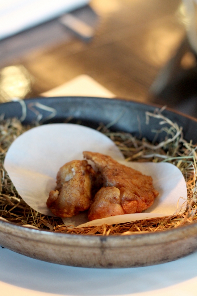 Krokant gebakken zwezerik in hooi, later op een bord geserveerd met dungeschaafde champignons