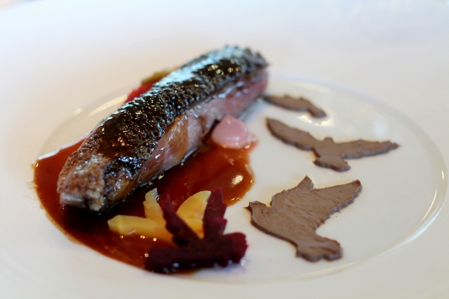 Onze favoriet: eend met een krokant huidje, in eendenjus, met eendenlever, rabarber en biet.