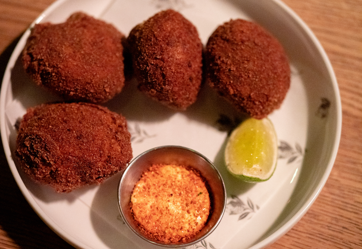 Wat je ook doet: bestel in ieder geval de Sjefietshe fish cakes. Daar kijk je misschien makkelijk overheen, maar het is het meest troostende dat we in tijden hebben gegeten. Een zachte vulling met heerlijke plompe stukjes gamba en een interessante mayonaise met mapuche (ook wel Merken of Merquen genoemd): een mysterieus specerijenmengsel op basis van gerookte, gedroogde chili en korianderzaad.