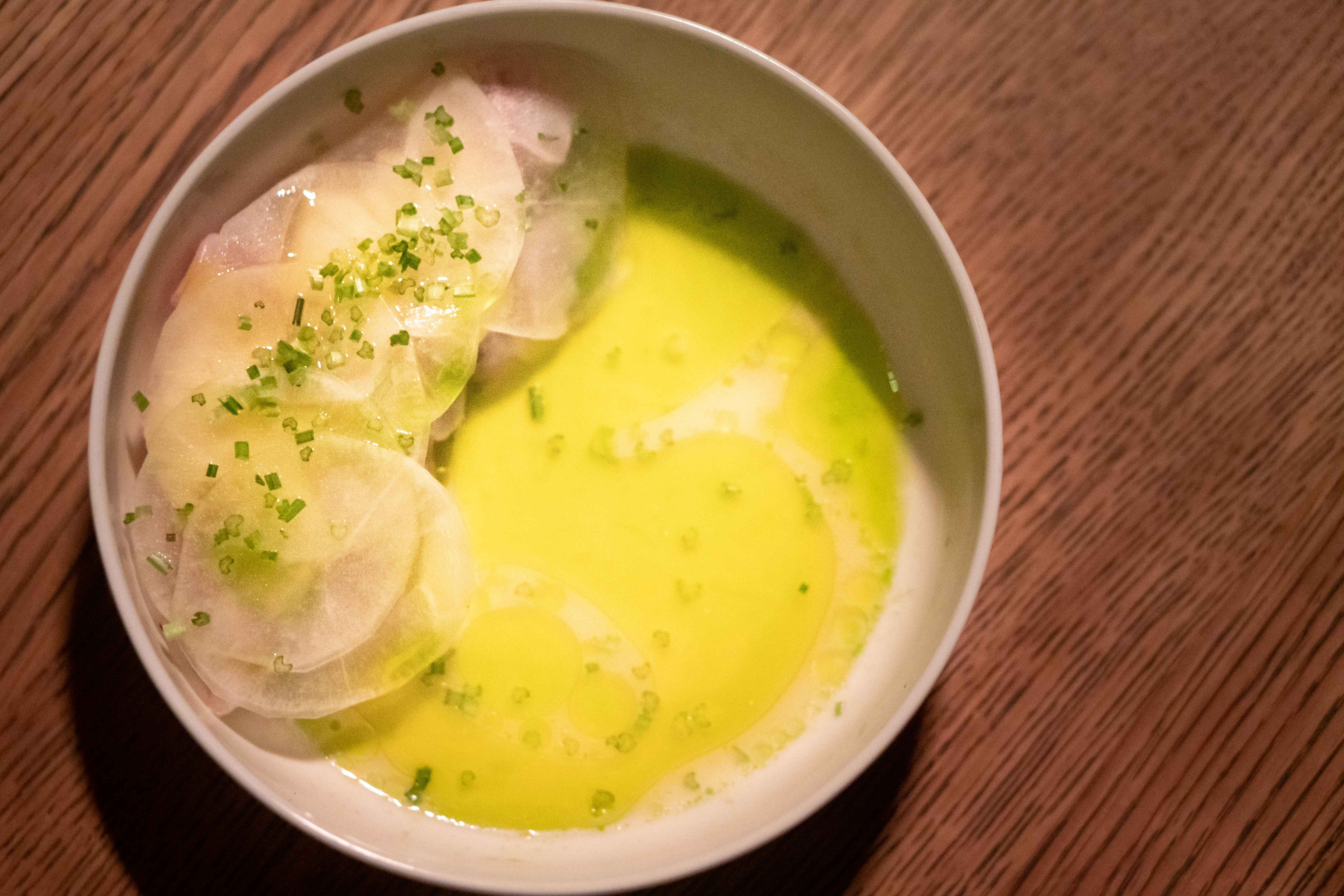 Spannender wordt het met de haast neongele ceviche van dorade met tomatillo, Madame Jeanette, ananas en rettich. De peper zorgt voor pit, de ananas voor het zuurtje en de flinterdunne plakjes rettich voor een fijn bittertje. Smaken die opwekkend zijn.