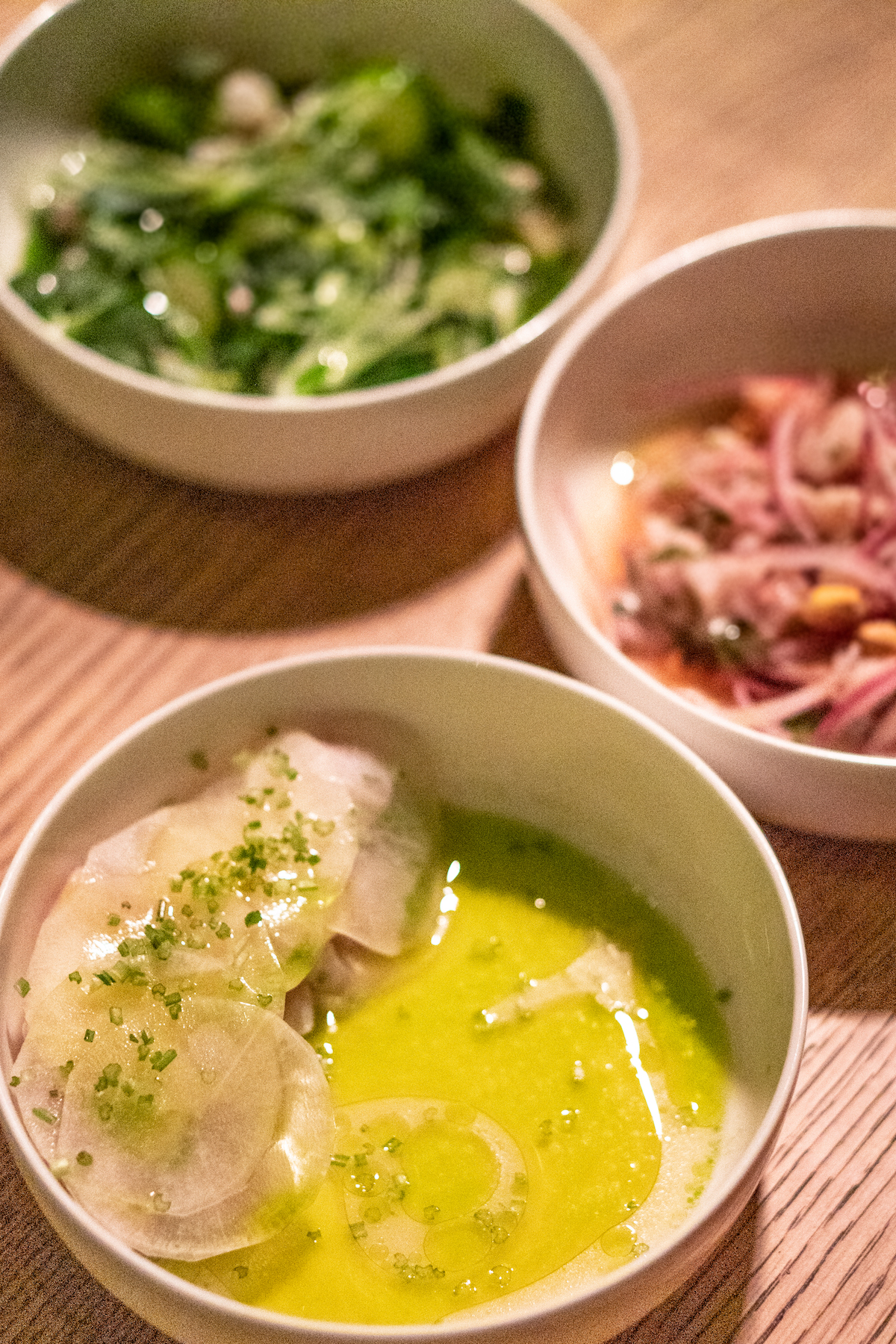 De derde ceviche: tiradito van hamachi (Dutch Yellowtail Kingfish) is een creatief gerechtje. Ook leuk: de vis wordt in Zeeland door twee jongens gekweekt. Want als we in Nederland makrelen kunnen kweken, kunnen we dat ook met hamachi (in het wild te vinden in Japan en Korea) – zo dachten ze.