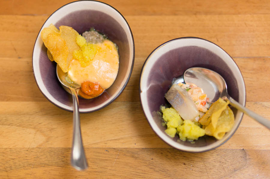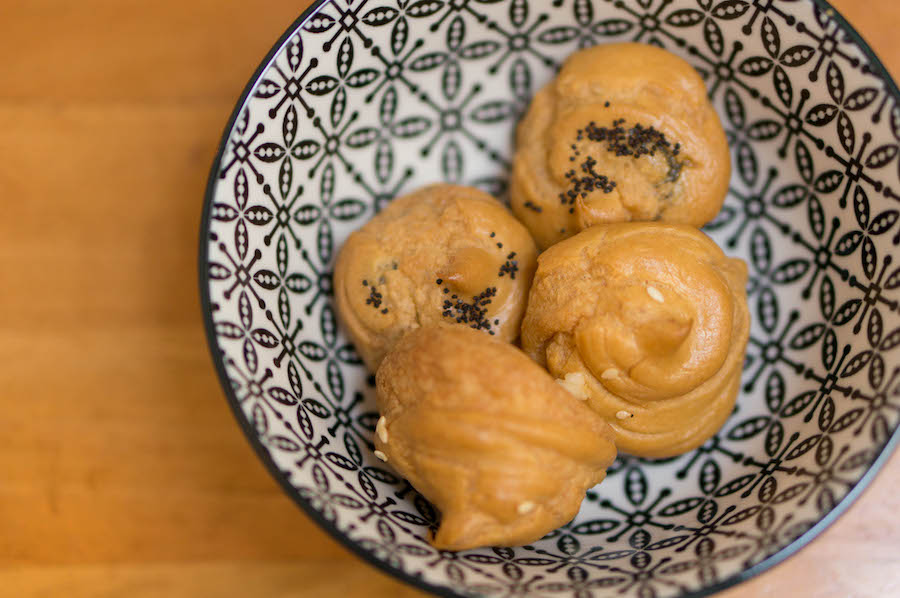 Bij binnenkomst werden twee verschillende soorten soesjes op tafel gezet. Eén gevuld met een crème van Reypenaer kaas en één met een olijventapende en zwarte sesam. Yum! Krokant van de buitenkant en smaakvol van binnen. Het werd ons voor de zoveelste keer duidelijk: soesjes zijn zwaar onderschatte lekkernijen.